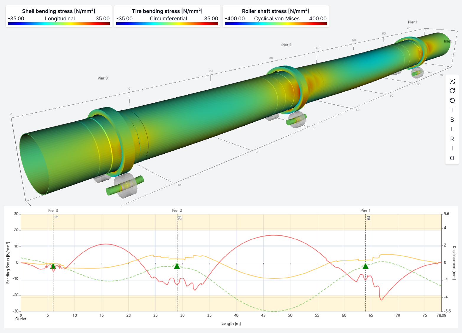 Use the tool to evaluate how shell thickness reduction due to corrosion affects your kiln – or how support loads, shell stress and tire stress change when the kiln axis is misaligned.